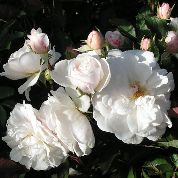 Važi za najlepšu belu sortu ovih ruža. Njeni cvetovi pokrivaju ceo žbun. |
